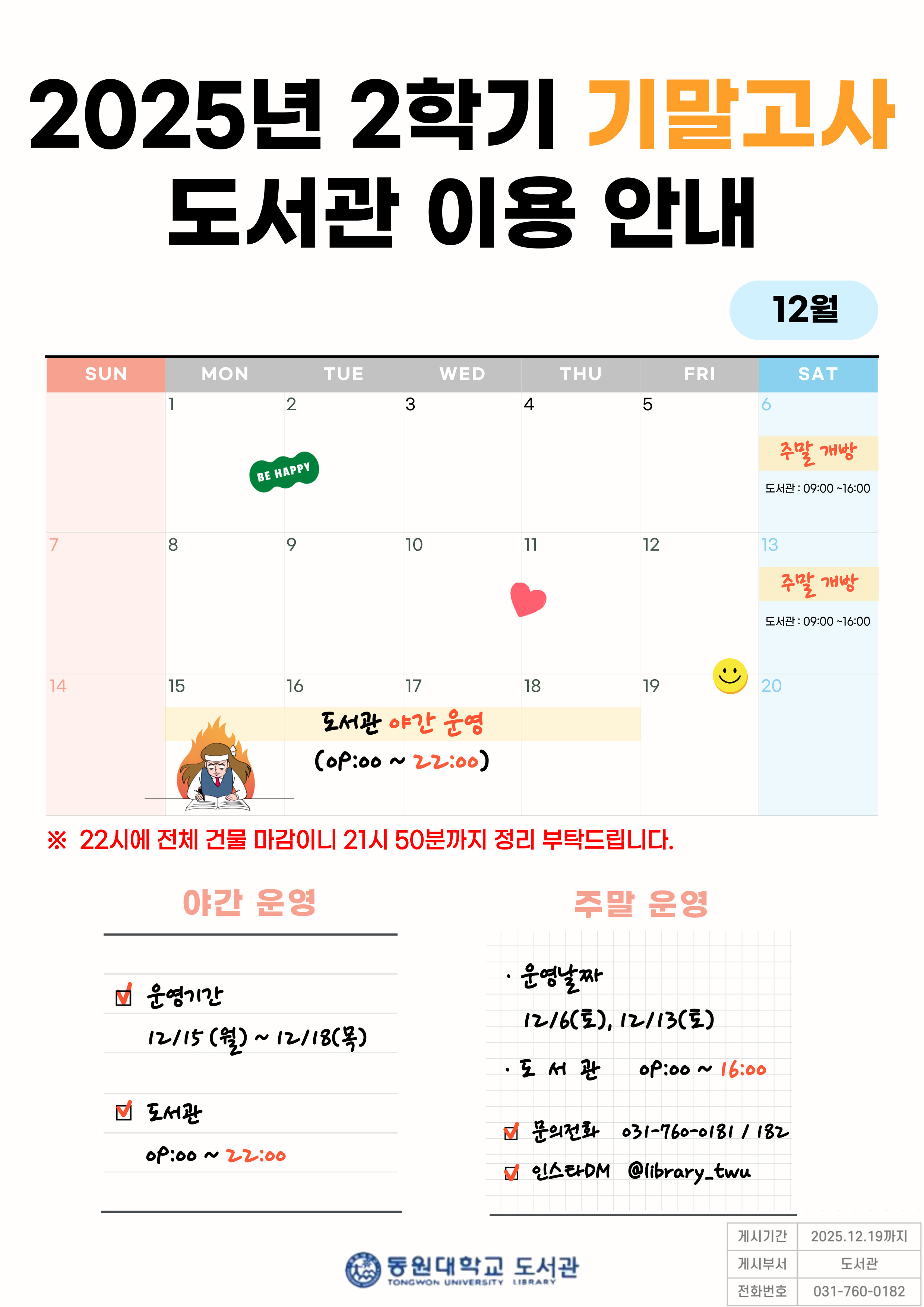 [도서관] 2025학년도 2학기 기말고사 기간 도서관 운영시간 변경 안내